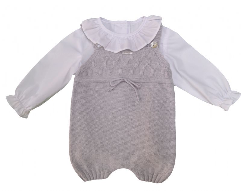 Confeccionado en España. Está compuesto por peto de punto en color gris y blusa de batista en color blanco con el cuello volante.