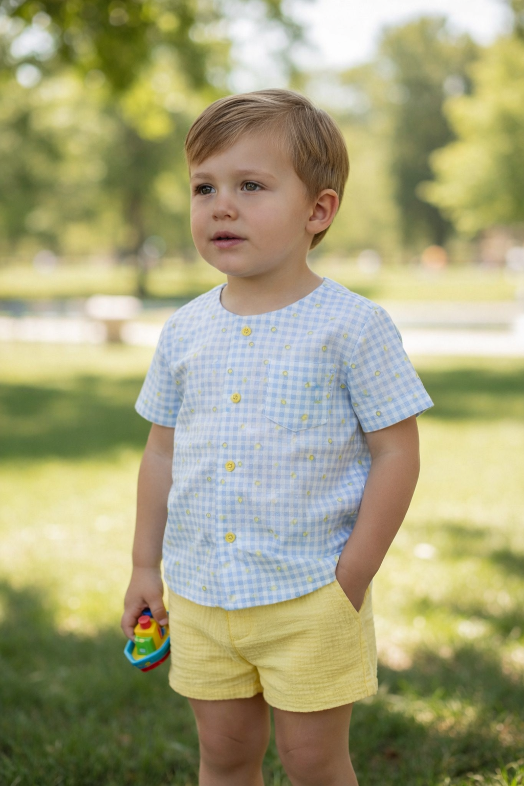 La camisa en cuadrito vichy azul claro se completa con pequeños detalles en amarillo, creando un estampado alegre pero delicado.