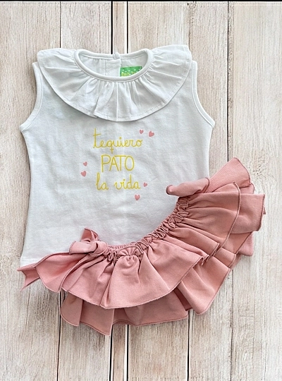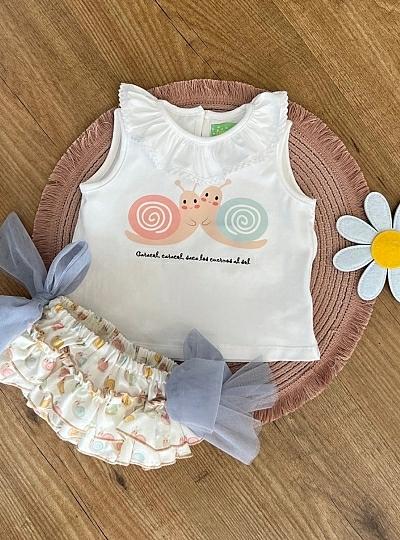 La camiseta lleva un bonito osito y la bermuda en cuadro vichy azul.