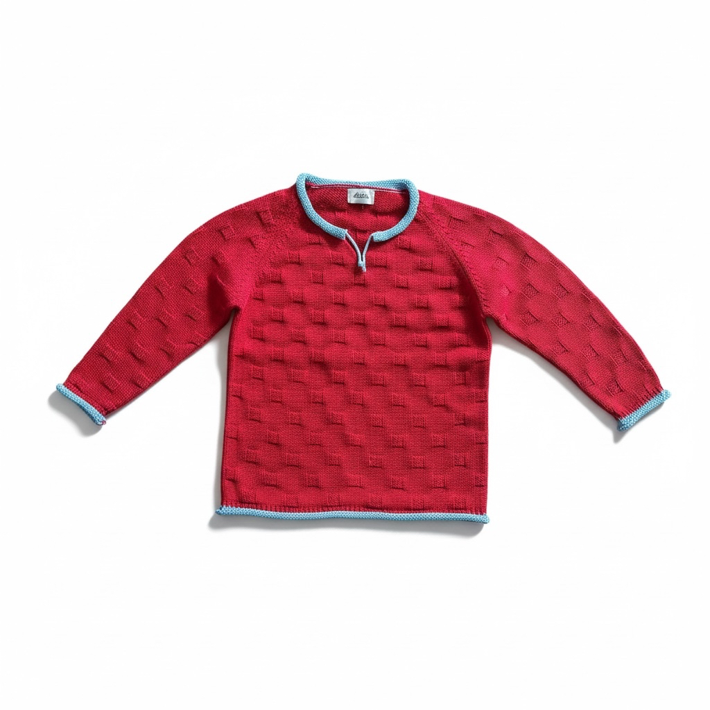 El punto en color rojo cereza tiene una textura delicada que se aprecia en el cuerpo del jersey, aportando un acabado más trabajado y bonito.