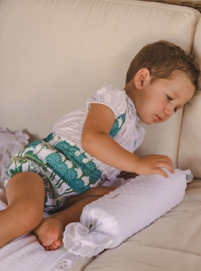 Ranita estampado en verde y turquesa combinado con plumeti blanco.